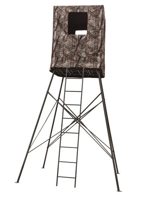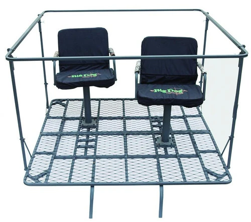 Two person hunting blind sits atop four metal legs. Features a large platform, two comfortable seats, and has a 500lb capacity. Full fabric camo enclosure included.