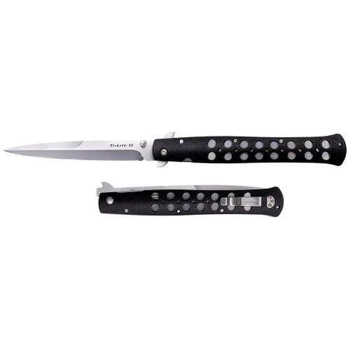 Features a sharp and strong AUS 8A blade, and ZY-EX handle. Equipped with patent pending, stainless steel leaf spring locks. For ease of carry, the Ti-Lite comes equipped with a small, but unobtrusive pocket clip, and can be opened rapidly by using the thumb studs. Blade length: 6”, Handle Length: 7”, Overall Length: 13”.