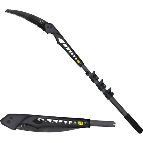 The Ranger Pole Saw features a patented teeth design for cutting branches and limbs. The 11-inch saw blade is made from SK5 high-carbon steel with a black titanium nitride finish to resist corrosion. The lightweight aluminum pole extends 6-feet and has a cast aluminum head and allows the saw to fold down when closed.