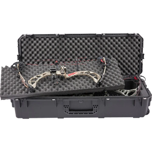 Injection molded watertight double bow case features a rigid foam bunk-bed system for secure storage of two parallel limb bows or a combination of a bow and a rifle. Includes inline skate wheels, reinforced padlock holes, and three cushioned carrying handles. Comes with a lifetime warranty and content coverage for gear damaged by an airline.